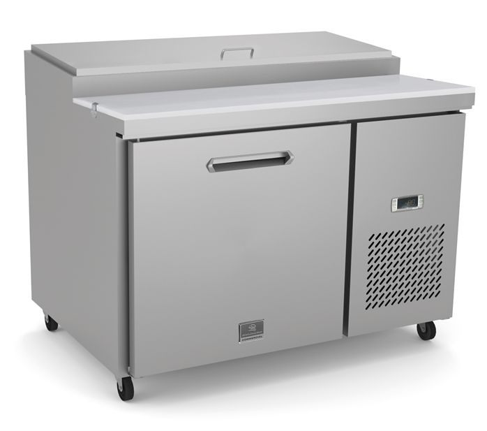 Built to endure rigorous use, the Kelvinator Commercial refrigerated pizza table is made of aluminum, galvanized steel, and stainless steel—rust-resistant, simple-to-clean metals. This table is positioned on heavy-duty casters to assist in relocation. The Kelvinator Commercial pizza prep table's stainless steel workspace features a full-depth cutting board and three built-in ingredient compartments that can accommodate 12 third-size pans.Read More