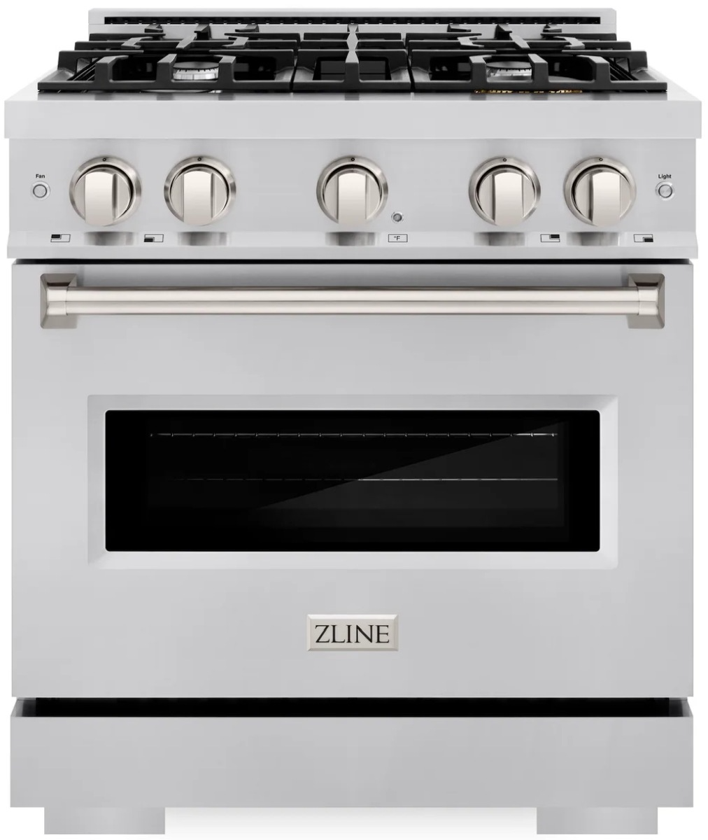 The ZLINE 30 in. 4.2 cu. ft. Classic Dual Fuel Range with 4 Burner Gas Cooktop and Electric Convection Oven in Stainless Steel (CDR30) combines the elegance of a hand-finished porcelain gas cooktop with 4 Italian-made auto-reignition burners, an electric convection oven with an energy-efficient cooling fan to ensure quiet operation, and a Landscape oven door window design allowing you to master every meal.
